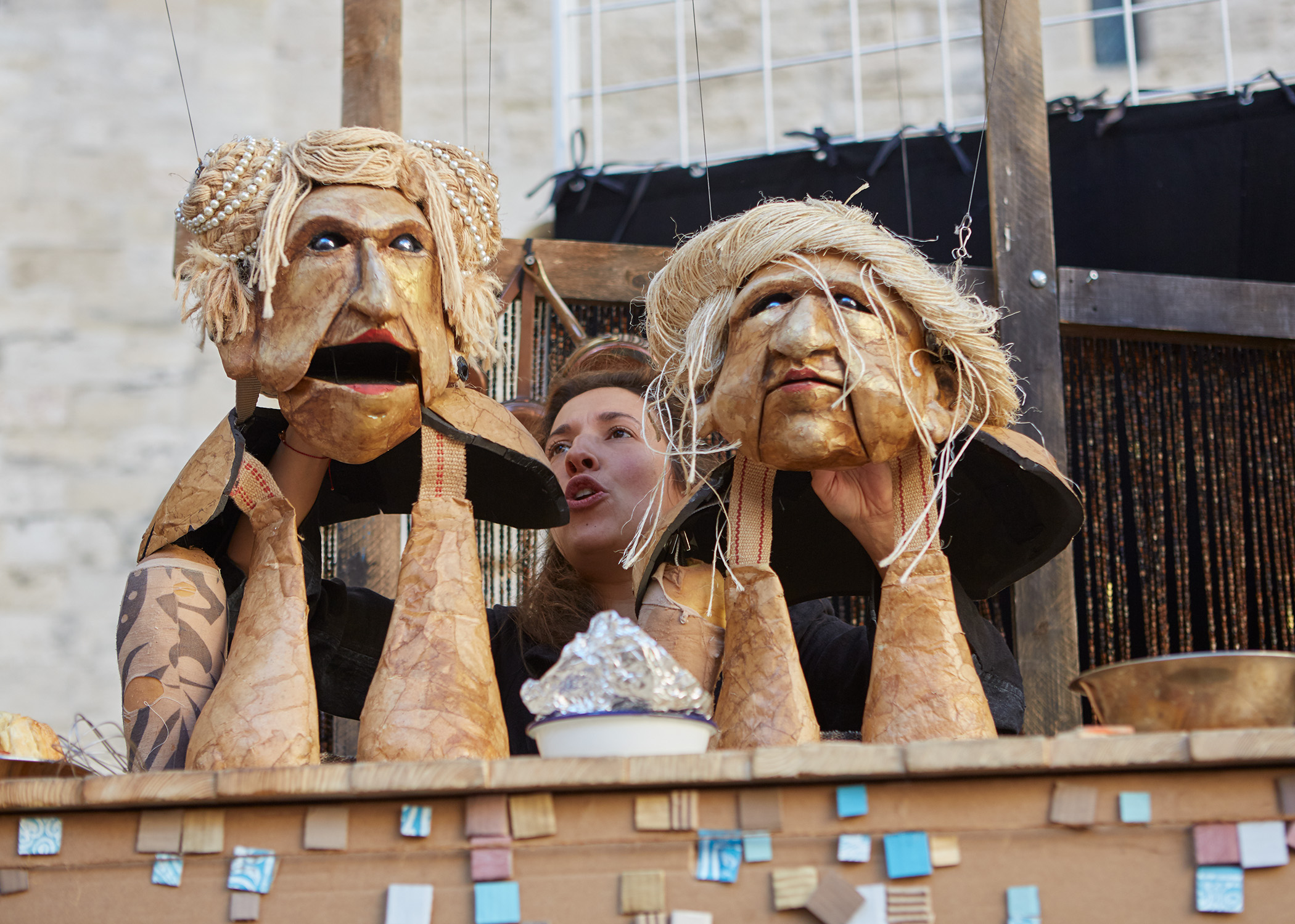 Sur scène, les marionnettes flamboyantes des Anges au Plafond côtoient les mots de l’autrice Estelle Savasta pour tenter de renverser la table dans une mise en scène commune des deux compagnies.